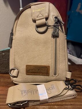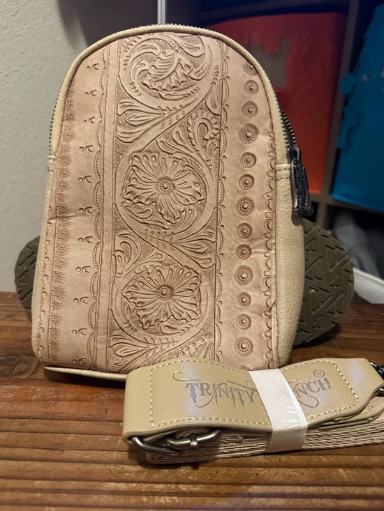 Compact Trinity Ranch crossbody with embossed floral panel. Smooth tan body and adjustable strap. Classic, feminine tooling for everyday wear. Secure zip closure.