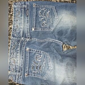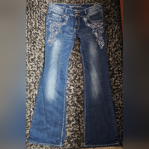 never worn but washed. beautiful low-rise flared jeans. sequin detail.