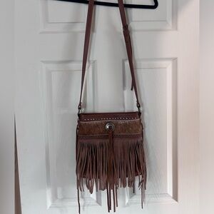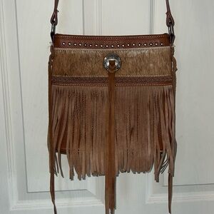 Great purse! Lightly used, lots of pockets, adjustable strap, leather with cow-hid!