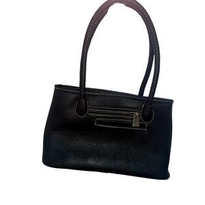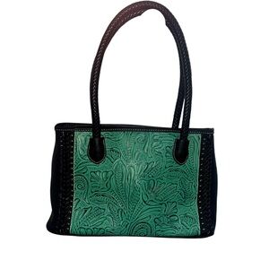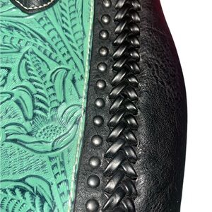 Tooled turquoise on front, black leather on back. Zip top, pockets inside, zip outside pocket. Excellent condition! Handle drop: 10”, 14.5x8.5