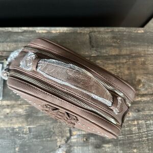 Trinity Ranch saddle bag in brown with woven front detail and stud accents. Two zippered compartments keep essentials organized. Removable adjustable strap for hands-free convenience. Soft textured exterior with subtle polished hardware for everyday wear.