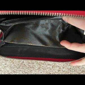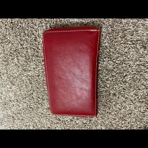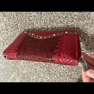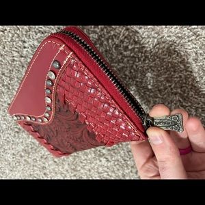 Red Trinity Ranch wallet. It has 8 card pockets, 2 slim pockets and 2 dividers, 1 zippered, 1 slim. This wallet is in perfect condition and was only used once. It originally came with a wristband attached but I used it for other wallets and it got torn apart, apologies, it won’t be included in the sale.