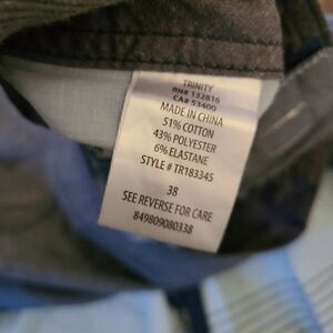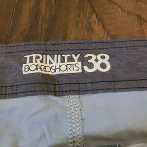 This is a pair of board shorts by Trinity. They are grey with blue, green, and white colorblock stripes. These board shorts have pockets and a drawstring at the waist.