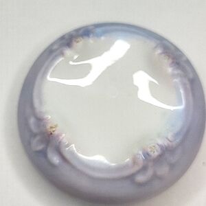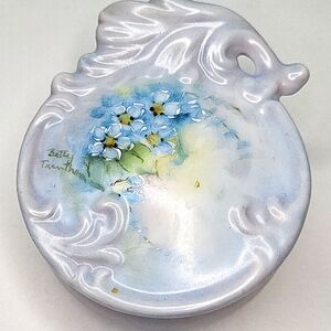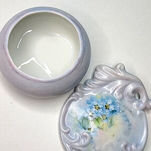 Designed and signed by Betty Tranthorn. Beautiful light blue round dish with lid. The lid has stunning details. No chips or cracks.