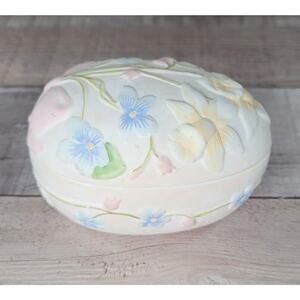 Vintage Silvestri egg shaped trinket dish with lid has raised floral pattern all over hand painted in pink, blue and yellow daffodils. Measures just over 2" high and a little over 3" long and is in good preowned condition.