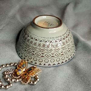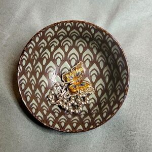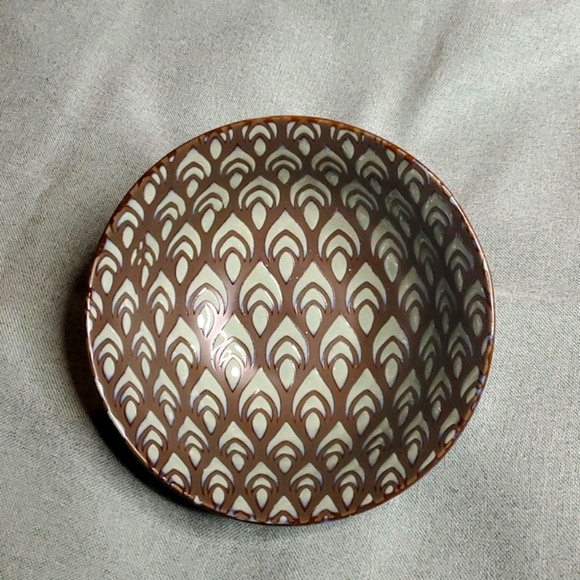 Small Ceramic Bowl, Trinket Dish with aqua green & brown leaf/feather design inside the dish, green with brown design outside.