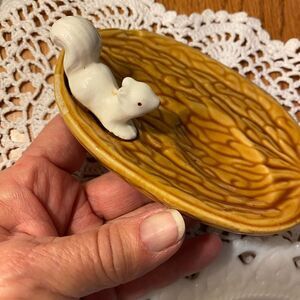 Look at this little Walnut with the squirrel attached and a spot to place a real walnut. Did they not make the most adorable items back in the 50s and 60s ? I have paired it with a rounded milk glass plate. I believe that it is the bottom of a butter dish. You could also use it to place your keys were cell phone on if you are a collector of glass.