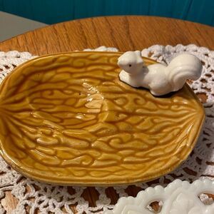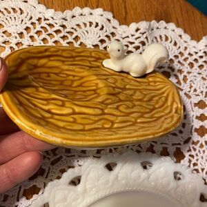 Trinket Dishes walnut with Squirrel and white round milk glass plate vintage lot