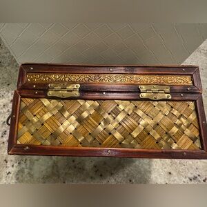 It features a woven exterior framed with carved wood accents and a vintage-style latch. The curved lid gives it a treasure-chest feel, making it both functional and eye-catching.