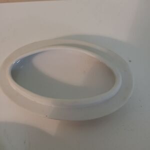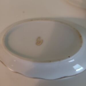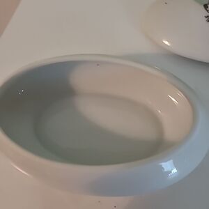 Pre-owned in good condition. Lidded box of white porcelain trimmed in gold with a picture of a dog. It is approximately 4.5 inches long and 2.5 inches wide. It is an oval shape.