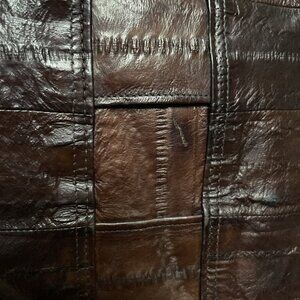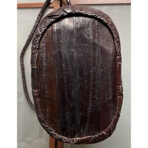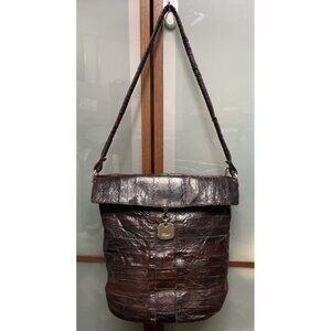 The Trio! Mahogany Genuine Eel Skin Vintage Flap Zip Bucket Shoulder Bag Purse is a stylish and unique medium-sized shoulder bag made from genuine eel skin. The oval-shaped bag features a zip closure, gold-plated hardware accents, and a lined interior with an inner pocket for organization. The brown exotic exterior adds a touch of retro charm, making it perfect for various occasions such as casual outings, parties, or evenings out. This vintage eel skin bag also includes a bag charm and a rounded versatile shoulder strap with a 12.5-inch drop for added convenience and style.