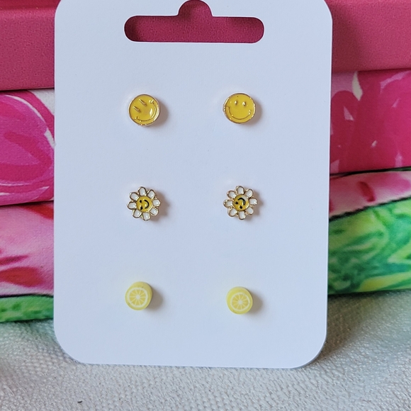 Three pairs of cheerful yellow earrings. Includes smiley faces, daisy blossoms, and lemon slices. Fun, bright accessories for everyday wear.