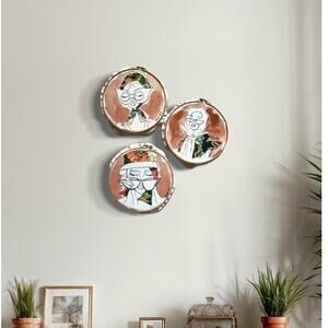 This unique set of three embroidery hoop artworks combines minimalist abstract line art with vibrant fabric accents, making it a striking addition to any modern or eclectic home. Each hoop features a stylized female figure, with bold linework that captures expressive poses and facial expressions. The carefully placed floral fabric elements add a touch of elegance and texture, blending seamlessly with the painted backgrounds to create a captivating visual effect.