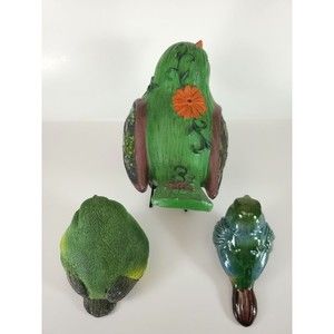 - largest is approx 6.5" tall. Green resin with orange flowers & beak. Brown wings with inset mosaic multicolor design. Stands on metal feet. She is in good condition but does show some wear/age to the wings, & a bit of paint worn off the leaf on the top of the head.