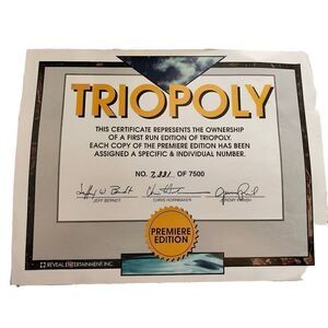 Triopoly Premier Edition #7331/7500 ---Limited editionThe Three Dimensional Monopoly!!!Triopoly set is comprised of:three game boards two dice 8 game tokens 16 red Gas Stations (represented by gas pumps) 22 green Shipping Malls, 22 blue Skyscrapers One deck each of Travel and Stock Market cards Property Title cards for each property and a supply of play moneyTriopoly Premier Edition, 1997: The original version of Triopoly - only 7,500 were printed. Each one included a signed and numbered certificate of authenticity.Numbered 199 of 7500"Triopoly, the Three-Dimensional Game of Buying and Building Cities Three Levels of Strategy! Three Ways to Play! Three Times the Excitement! Add exciting new dimensions, discover innovative game-playing strategies and build a fortune as you move across three different levels. Buy, sell, and trade properties from 15 American cities as you negotiate your way to a three-tiered victory! Three board levels means three times the player strategy.