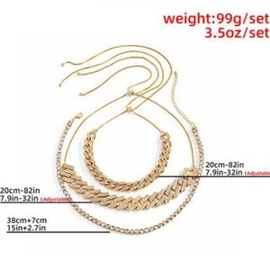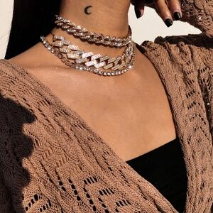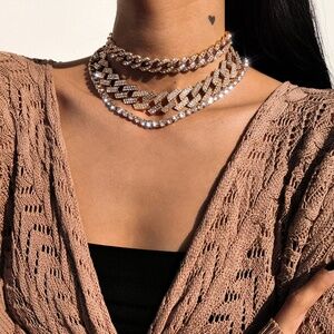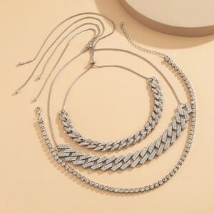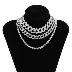 Triple Diamond Rhinestone Layered Necklace Set, Cuban Link Necklace, Tennis Necklace, Gold Plated, Silver Plated