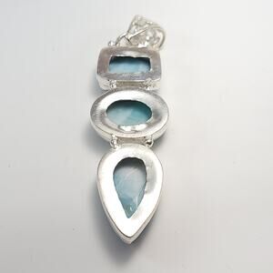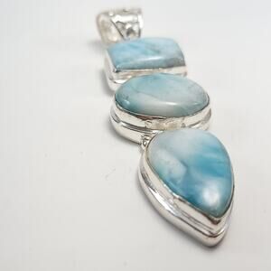 Handcrafted with care, this 2.5-inch sterling silver pendant features three Larimar stones, each selected for its serene beauty and tranquil blue tones, complemented by an 18-inch silver necklace. A tribute to the calming energies of the sea, it's a perfect piece for those seeking harmony and style.
