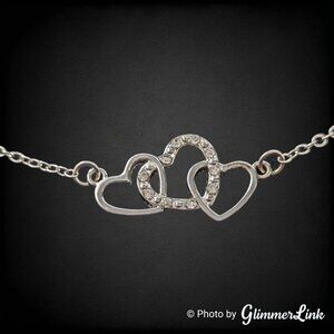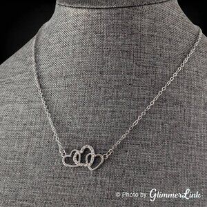 Dainty silver tone pendant necklace featuring three Interlocked hearts. The middle heart is accented with clear rhinestones.