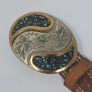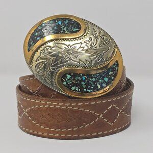 Triple K Tooled Leather Belt with German Silver and Turquoise Western Buckle 34