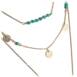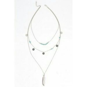 Three strand chain necklace comes in gold tone or silver. Lowest pendant has a feather. Middle has metal coins/discs with turquoise beads and top layer has a row of turquoise beads. Choose silver or gold in the "size" selection when you buy or add it to a bundle. Remember, the more you buy the more you $ save!