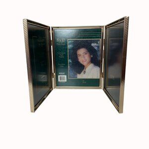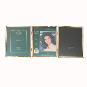 Triple Photo Frame Gold Tone Non Glare Glass VTG 8x10 Picture Tabletop Display