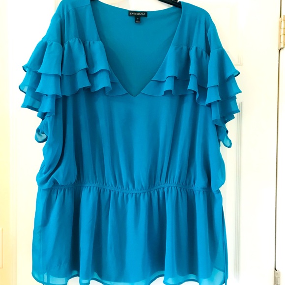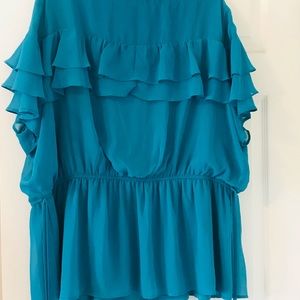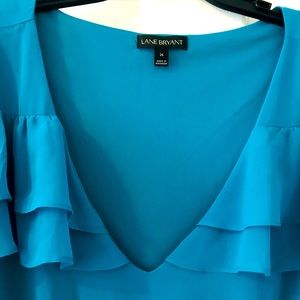 This beautiful, teal blouse has 3 translucent layers of ruffles on sleeves with 2 layers across front. V-neck, semi-sheer, blouse offers an elasticized mid-waist with strings on each side that can be tied making bows. Very elegant. Lane Bryant size 26.