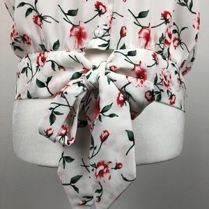 Triple Seven Button Up Front Tie Floral Blouse Large Cap Sleeves