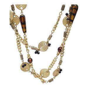 Triple Strand Faux Tiger's Eye Glass Spiral Disc Station Chain Necklace Gold Tone Vintage High End