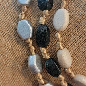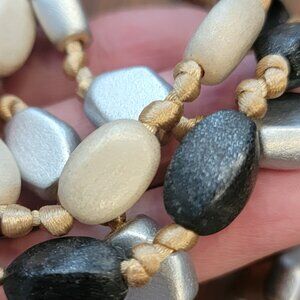 triple-strand beaded necklace featuring cream, silver, and black wooden beads.