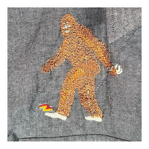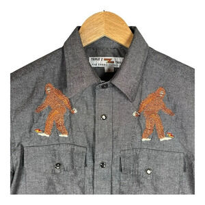 Triple Z Threadz "Fine Embroidered Crap", embroidered Sasquatch Big Foot on chest, front pockets, gray, pearl snaps, short sleeve, men's size small.
