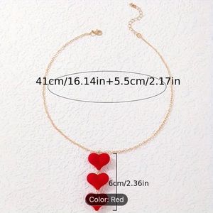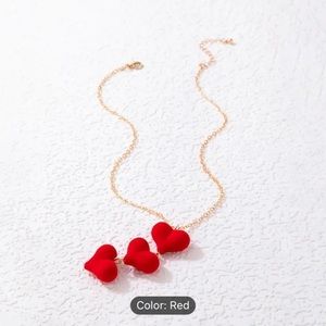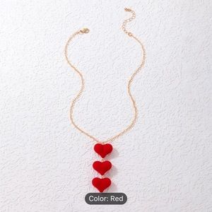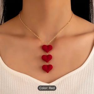 Beautiful triple read heart necklace in faux velvet with gold tone hardware. Perfect complement for your Valentines Day outfit!