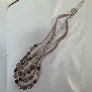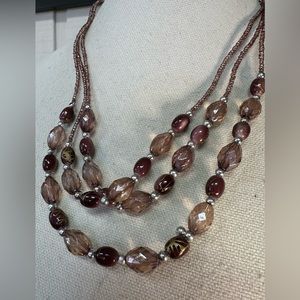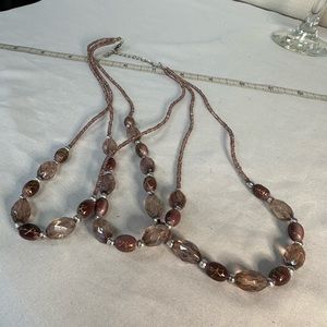 Very pretty purple taupe bead necklace with touches of gold swirls on the darker of the beads. There are also oblong faceted beads which are transparent with the same color scheme.