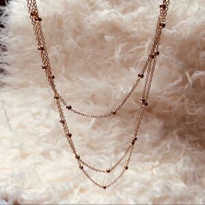 This cute necklace is gold toned alloy. The longest chain is about 18 inches and the shortest chain is about 14 inches. This has a 2 inch additional extender. New in package.