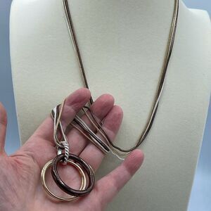 Triple strand mixed metals chains rings pendant necklace.This is a fun go with anything necklace. Long three Serpentine chains in gold silver and bronze. Lobster claw clasp with rings decor.