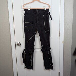 Bold black tactical cargo pants designed for alternative fashion with extensive hardware detailing and utilitarian style.