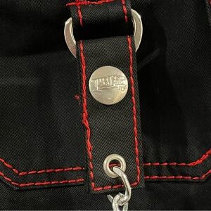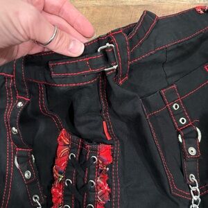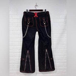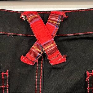 Tripp's standard darkstreet pants get a girly edge with these lace-up chain pants. The black flare leg pants have red contrast stitching have red plaid lace-up detailing below the front pockets, silver tone removable chains and silver tone hardware detailing.