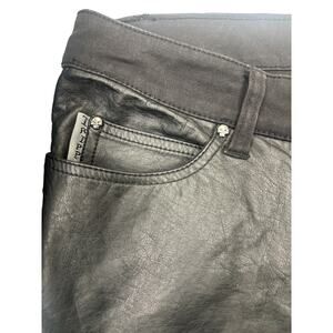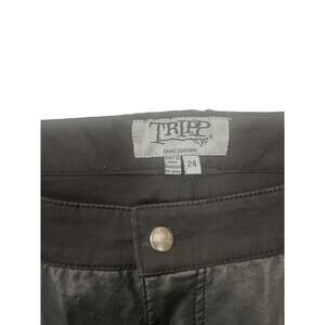 -Tripp NYC pants with faux leather in front / fabric on back. Size 24. Skull ornament on pockets as seen on picture. Pre owned great condition. Measures 42” at waist and 40” length. Minor wear on right thigh see pictures.