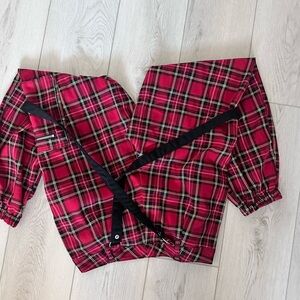 Stylish red plaid cargo pants by Tripp NYC. Features multiple pockets and adjustable straps. Perfect for a bold, edgy look.