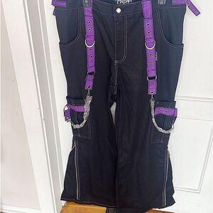 Tripp doesn't believe in plain pants, and these are proof. Featuring purple strap details with D-rings, grommets and chains, with hip and rear pockets, side patch pockets and zippers down the lower leg.
