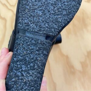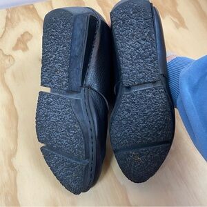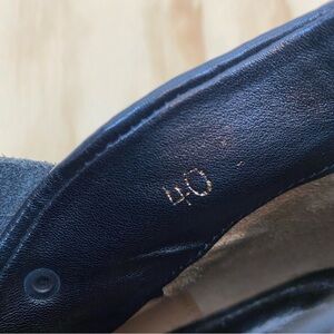 Elevate your shoe game with these stylish black leather split-wedge, platform ankle boots from Trippen. Almond toe shape, back/heel zipper, overlapped design with stud accent, rubber sole. Hard-to-find retired style.