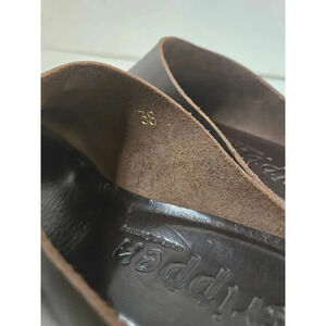 Sham is a women's wedged mule from Trippen. Made in Germany, in premium leather. This mule is leather lined and has a leather footbed. Sham stands tall on a 2¼-inch durable rubber platform wedge. This shoe runs true to size.