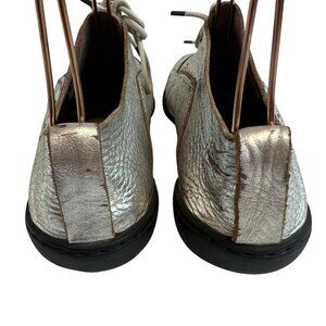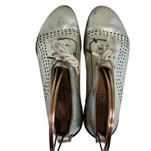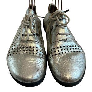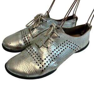 Trippen shoes, silver pebbled leather with perforations, lace up, round toe, rubber soles, EU 36 / US women's 6, preowned and shows wear on the soles, scuffing and wear on the exterior - see photos