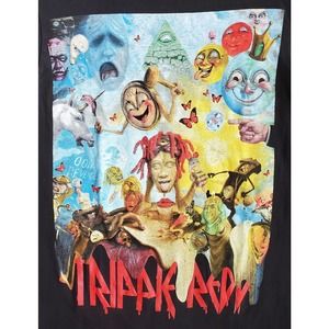 This is an official Trippie Red T-shirt Merch. It has a cool design on the front of Trippy Redd and trippy artwork! The print is on a standard short-sleeved black crew neck shirt. The shirt is in great condition!