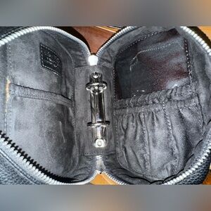 Trish McEvoy “The Power Of Makeup” Planner in black vegan pebble leather. Great condition minor signs of wear (refer to photos). Designed to organize and store your makeup and tools on the go. Inside has a ring binder mechanism to hold your Trish eyeshadow palettes and refills. A removable small mesh black pouch to store smaller items. Elastic pockets to store your brushes. Ideal for travel.