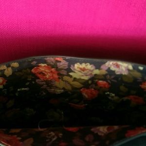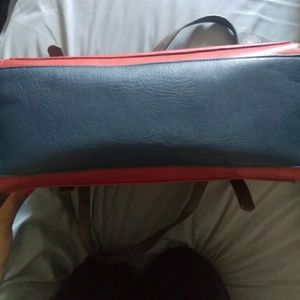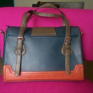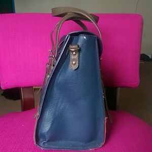 Purse/ satchel that's triangular shaped ( think Burkin in terms of the base shape) with matching blue shoulder strap. It fits a lot in it, it's held 3 notebooks in it and a tablet. The accent hardware is gold, and the locking clasp is a slide button.