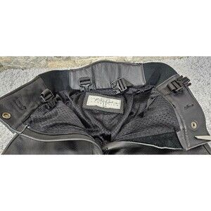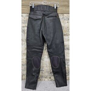 Edgy black leather pants with reinforced knee details. Ideal for a bold, adventurous style.