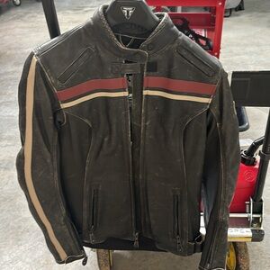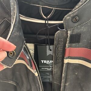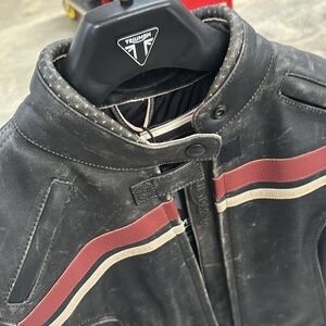 This hard to find vintage Triumph Raven ladies motorcycle bomber jacket combines a sleek black leather finish with bold red racing stripes for a sporty, modern look. This jacket is slightly distressed. The high collar and zippered front enhance its classic varsity style, making it a standout piece in any wardrobe.