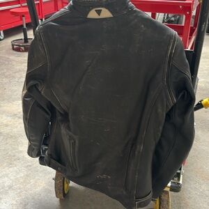 This jacket features a full D3o jacket set, action back, perforated panels, and a luxurious printed liner. Vintage leather construction, with removable CE certified D3o protectors, shoulder, elbow, and back removable, quilted, long sleeve thermal jacket liner with print action back for a comfortable fit while riding. Airflow, tech zip, opening, ventilation, and perforated leather panels.
