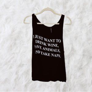 Scoop neckline. Text reads "I just want to drink wine, save animals, and drink naps."
