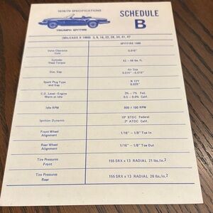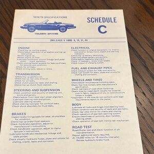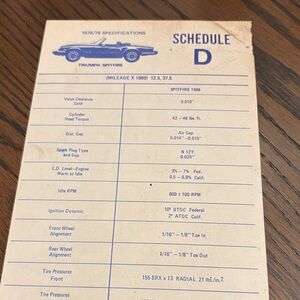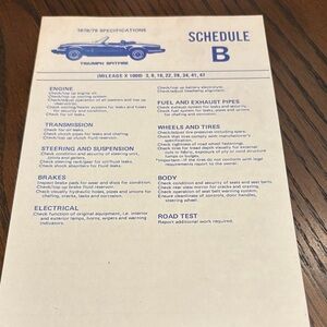 Set of vintage Triumph Spitfire specification sheets. Features detailed car information.